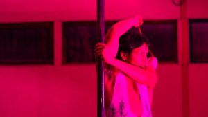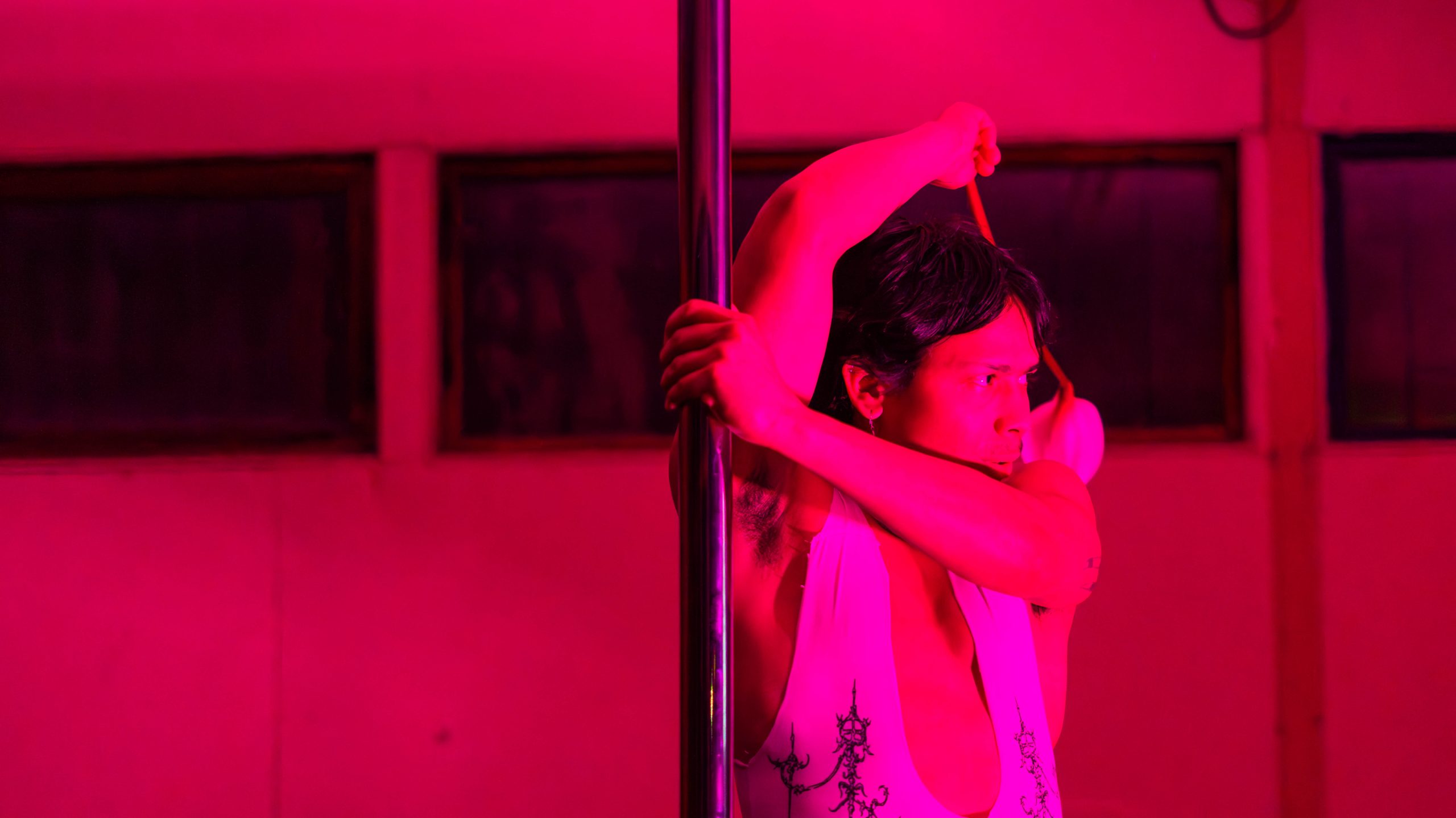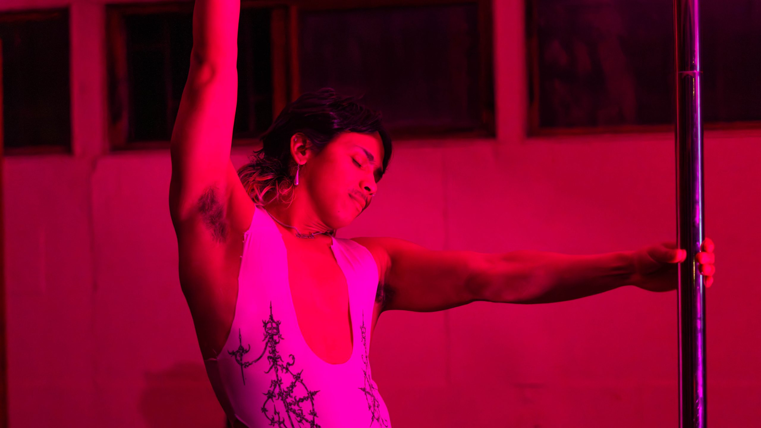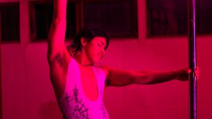 Andrew Artahona sorprendió con un espectáculo de pole dance que comenzó desde un auto, mientras se proyectaba en vivo a través de un sistema inalámbrico al data show, fusionando la danza con la estética visual de la noche.